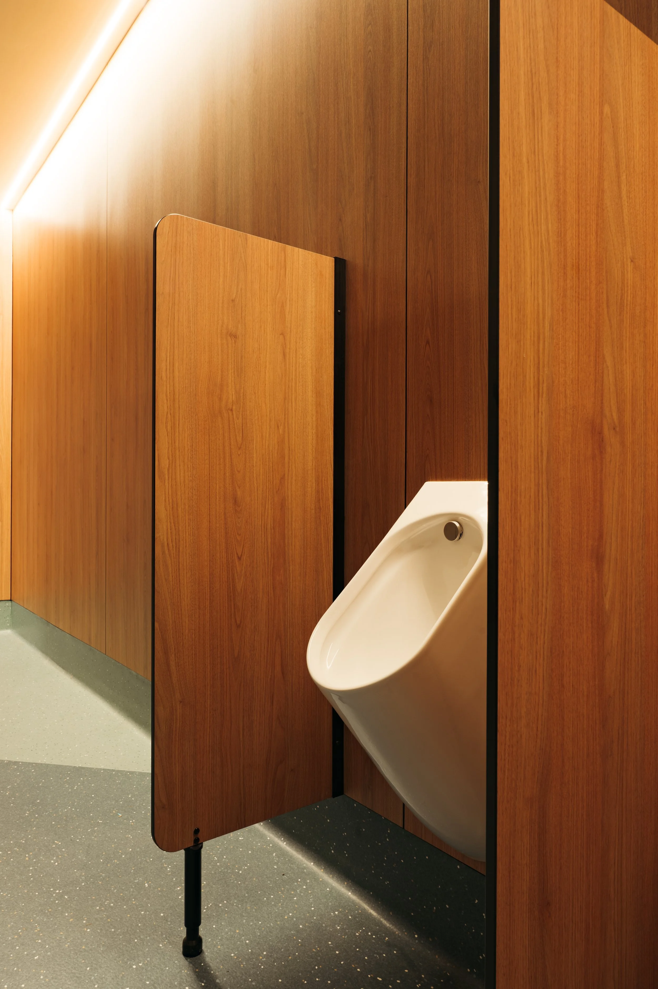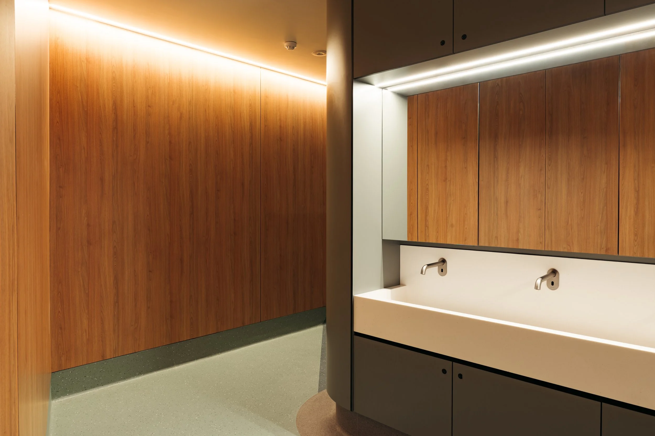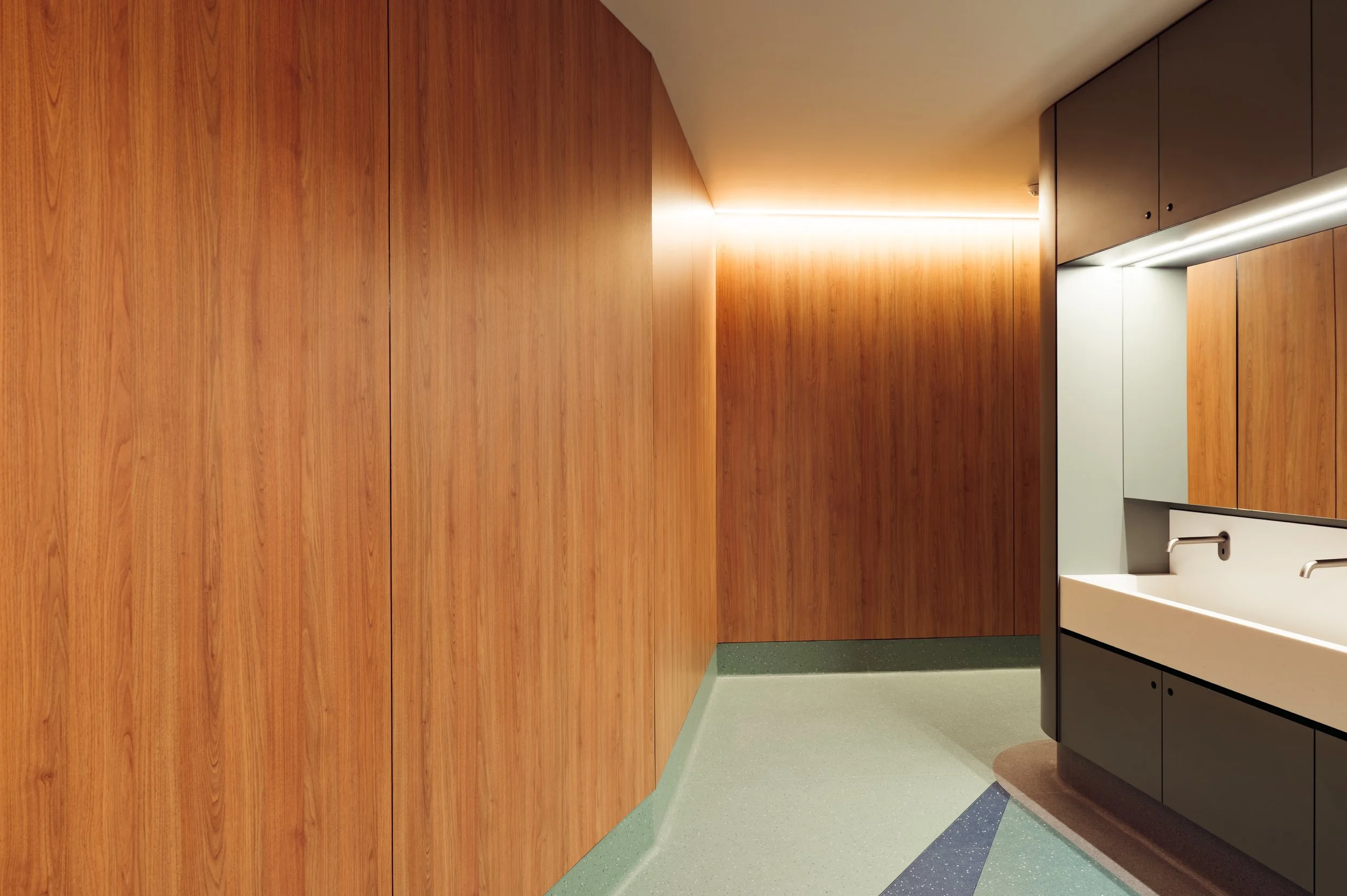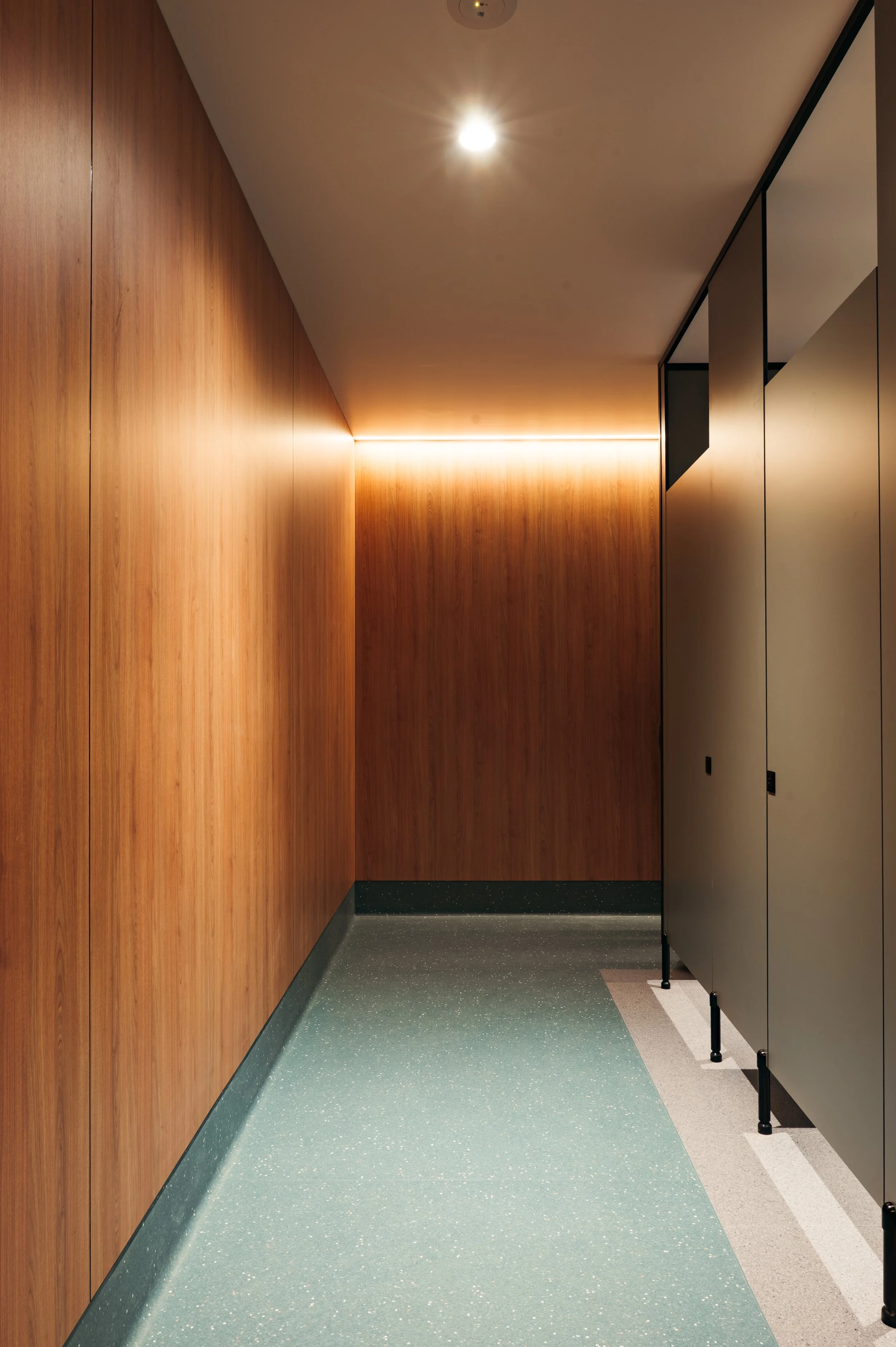 Timber-toned laminate wall linings introduce warmth. Impact-resistant compact laminate partitions provide resilience under heavy daily use. Commercial-grade slip-resistant vinyl flooring was installed throughout, engineered for high-traffic wet areas.